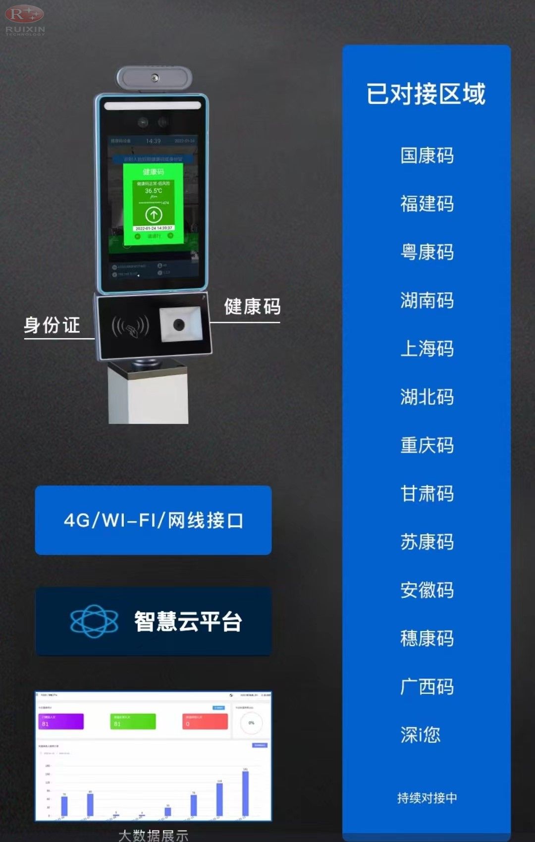 外置身份证和二维码识别模块,通过手机扫码或刷身份证,快速识别健康码状态;