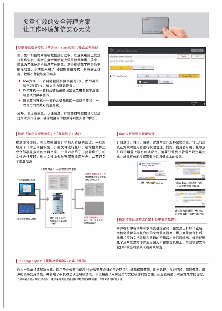 MP C3504exSP标配的10.1英寸SOP智能触摸屏相比9.7英寸iPad更大更清晰,并能提供与智能手机/平板电脑相同的智能化操作方式;内置的中央处理器采用与电脑相同的英特尔处理器,数据处理速度更快;机器前置人体靠近检测传感器,可在用户走近时提前进入待机状态;输出速度黑白彩色同速(每分钟35页);标配复印、网络打印和网络彩色扫描功能;支持最大4800dpi×1200dpi打印分辨率,可选购双面自动翻转送稿器或双面同步扫描送稿器,扫描速度最快可以达到180页/分钟(300dpi);内置2GB+2GB SOP内存(可扩展到4GB+2GB SOP内存)和250GB硬盘。高品质的彩色打印质量、更高的生产力,以及支持多种软件解决方案的产品特色,能够全方位地满足不同行业用户对于多样化文档输入输出的应用需求。