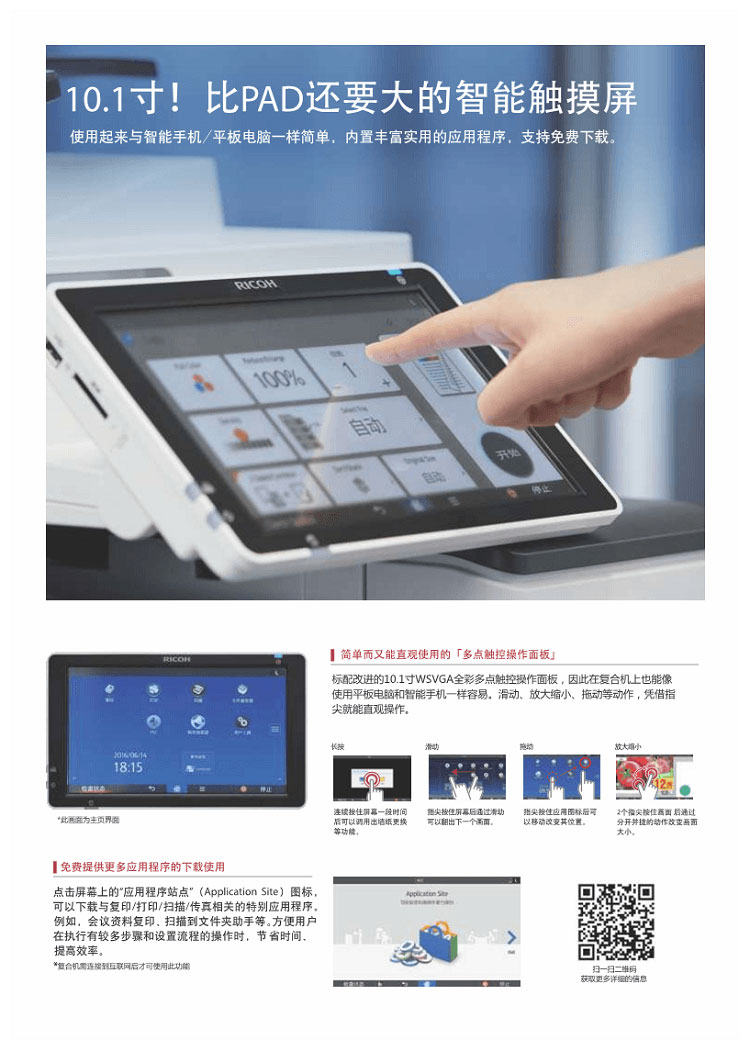 MP C4504exSP标配的10.1英寸SOP智能触摸屏相比9.7英寸iPad更大更清晰,并能提供与智能手机/平板电脑相同的智能化操作方式;内置的中央处理器采用与电脑相同的英特尔处理器,数据处理速度更快;机器前置人体靠近检测传感器,可在用户走近时提前进入待机状态;输出速度黑白彩色同速(每分钟45页);标配复印、网络打印和网络彩色扫描功能;支持最大4800dpi×1200dpi打印分辨率,可选购双面自动翻转送稿器或双面同步扫描送稿器,扫描速度最快可以达到180页/分钟(300dpi);内置2GB+2GB SOP内存(可扩展到4GB+2GB SOP内存)和320GB硬盘。高品质的彩色打印质量、更高的生产力,以及支持多种软件解决方案的产品特色,能够全方位地满足不同行业用户对于多样化文档输入输出的应用需求。